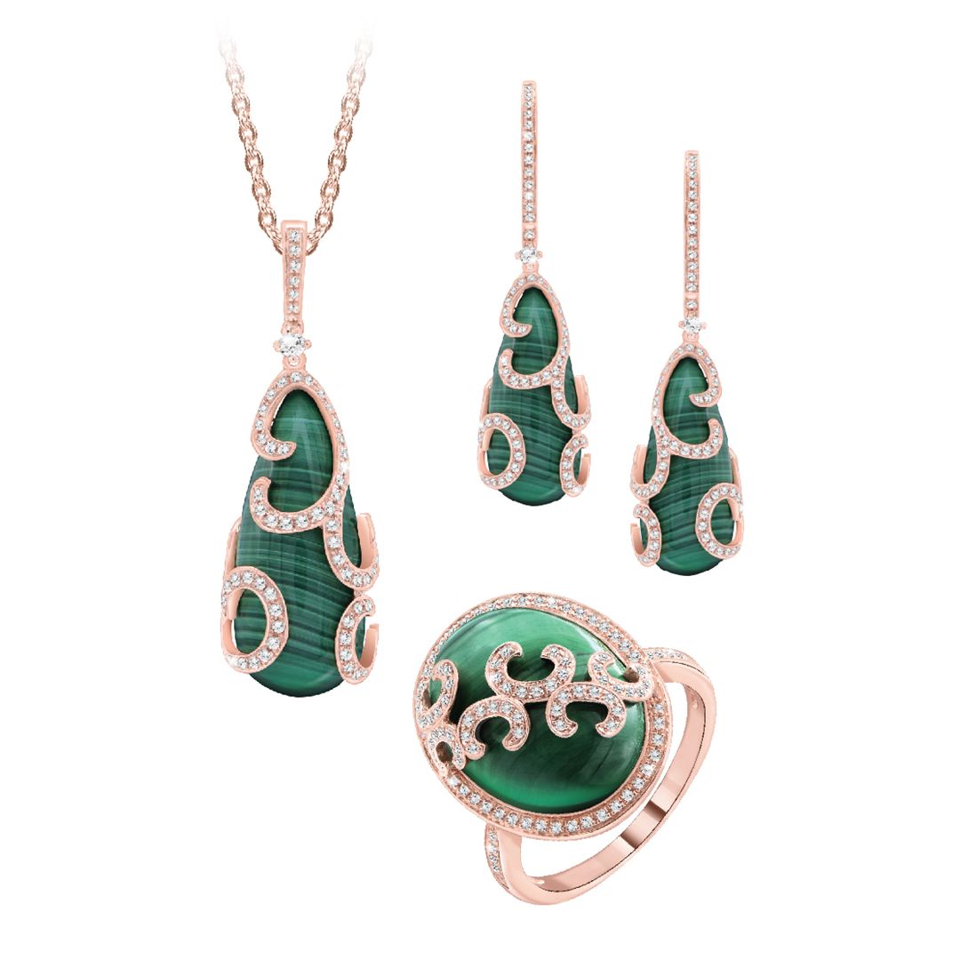 Ornaments - Pendant, ring, and earringsMetal - Rose gold/ Yellow goldMetal Weight - 5.4 gMetal Color - Rose/ YellowGemstone - Malachite