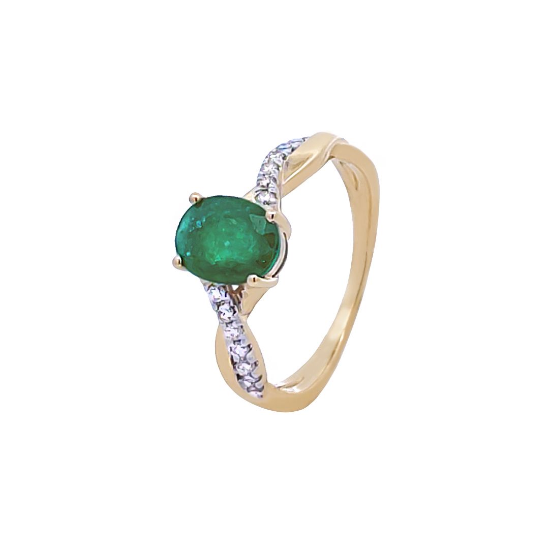 Petite Twisted Band Oval Emerald Diamond Ring in Yellow Gold